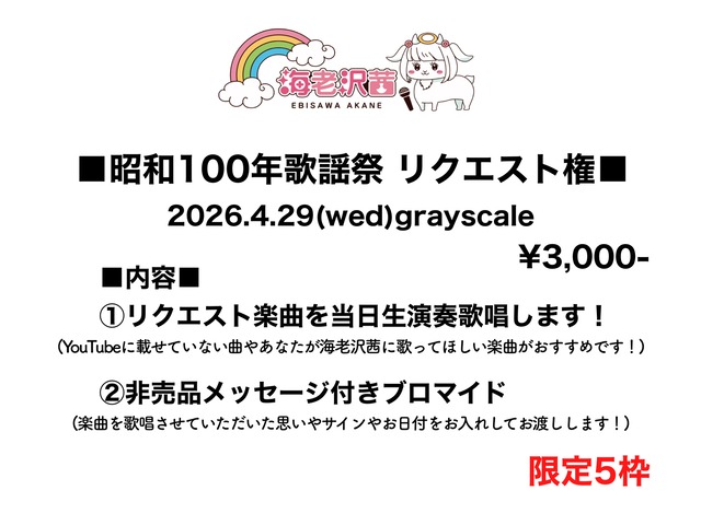 『昭和100年歌謡祭 第四弾』 2026年4月29日(水祝) 開場18:30/開演19:00 場所 grayscale 料金 来場¥4000+1drink 出演 海老沢茜 演奏 みやけしんたろぷん ご予約 : https://www.secure-cloud.jp/sf/1582397590YaAylsTz 限定商品のリクエスト権です! ■内容■ ①リクエスト楽曲を当日生演奏歌唱します! (YouTubeに載せていない曲やあなたが海老沢茜に歌ってほしい楽曲がおすすめです!) ②非売品メッセージ付きブロマイド (楽曲を歌唱させていただいた思いやサインやお日付をお入れしてお渡しします!) ※ご購入は3/9(月)21:00〜先着でお受けさせていただきます。 ※楽曲候補を2〜3曲ほどいただけると助かります。 ※ライブに来られない方でもご注文可能です。 *⑅︎୨୧┈┈┈┈┈┈┈┈┈┈┈┈┈┈┈┈┈┈୨୧⑅︎* X : https://x.com/ebisawa_akane Instagram : https://www.instagram.com/ebisawa_akane YouTube : https://youtube.com/c/AKANEEBISAWA Blog : https://ameblo.jp/akanepoyon/ Web : https://akane-ebisawa0108.jimdo.com/ Shop : https://akane0108.thebase.in/ Official LINE:@skx7651r